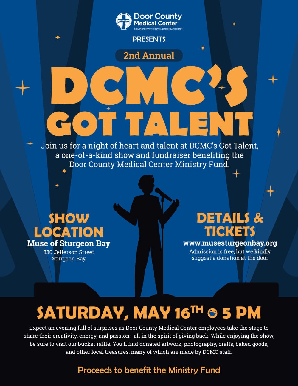 We are excited to announce the 2nd Annual DCMC's Got Talent! Mark your calendars for Saturday, May 16th, 2026 at 5 p.m. for a display of Door County Medical’s Center employee’s many talents. From art, to photography, music and even baking! You might be surprised by what you learn about the people that keep Door County healthy!